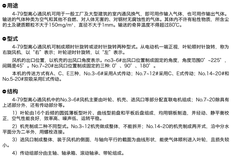 4-79型離心通風(fēng)機(jī)可用于一般工廠及大型建筑的室內(nèi)通風(fēng)換氣,即可用作輸入氣體,也可用作輸出氣體。