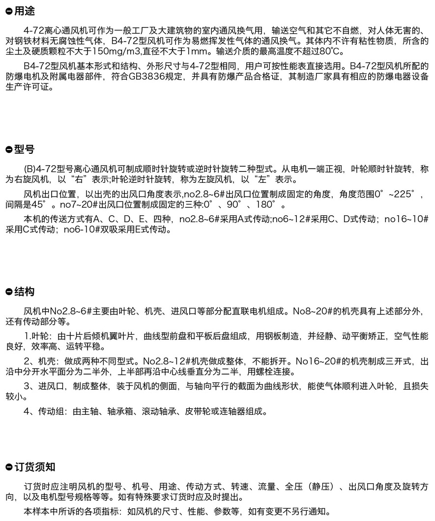 4-72離心通風(fēng)機(jī)可作為一般工廠及大建筑物的室內(nèi)通風(fēng)換氣用,輸送空氣和其它不自燃,對人體無害的、 對鋼鐵材料無腐蝕性氣體,B4-72型風(fēng)機(jī)可作為易燃揮發(fā)性氣體的通風(fēng)換氣。
