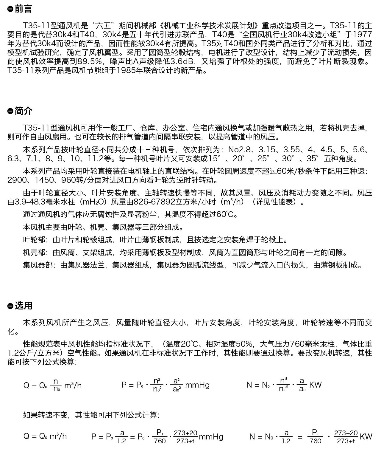 T35-11型通風機可用作一般工廠、倉庫、辦公室、住宅內(nèi)通風換氣或加強暖氣散熱之用,若將機殼去掉, 則可作自由風扇用。也可在較長的排氣管道內(nèi)間隔串聯(lián)安裝,以提高管道中的風壓