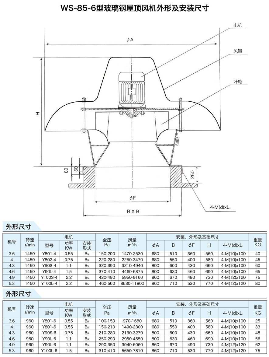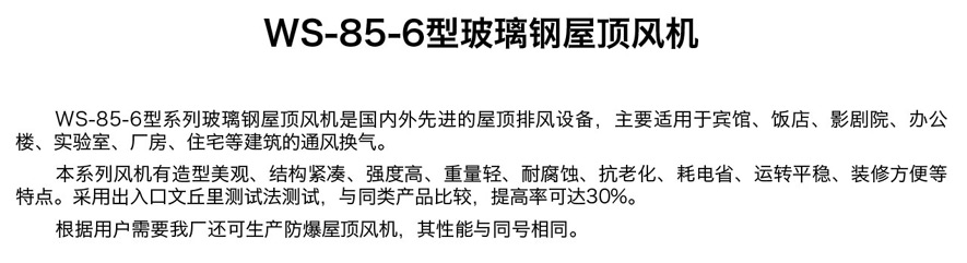 WS-85-6型系列玻璃鋼屋頂風機是國內(nèi)外先進的屋頂排風設備,主要適用于賓館、飯店、影劇院、辦公 樓、實驗室、廠房、住宅等建筑的通風換氣。 本系列風機有造型美觀、結構緊湊、強度高、重量輕、耐腐蝕、抗老化、耗電省、運轉平穩(wěn)、裝修方便等 特點。 采用出入口文丘里測試法測試,與同類產(chǎn)品比較,提高率可達30%。 根據(jù)用戶黑要我廠還可生產(chǎn)防爆屋頂風機,其性能與同號相同。